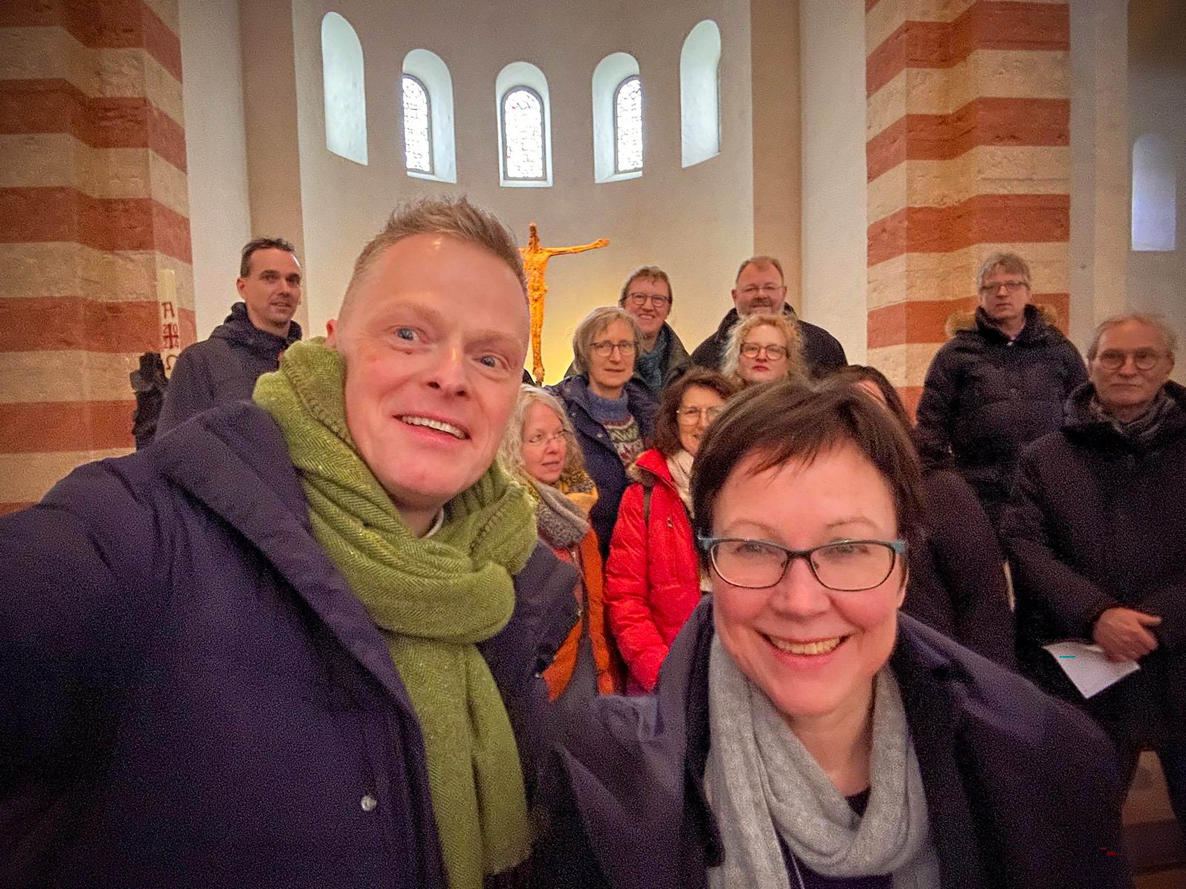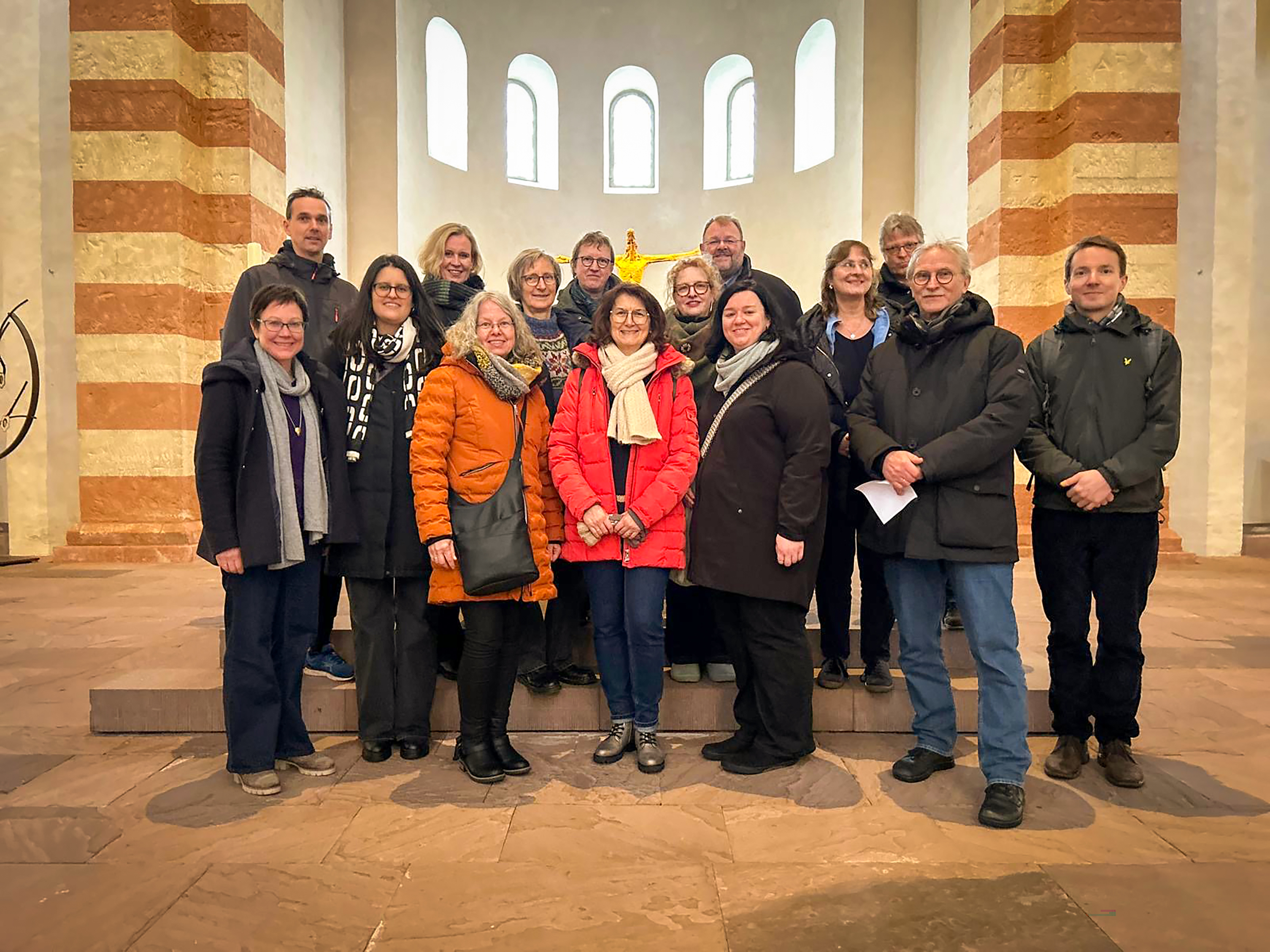 Einen Einblick in die Geheimnisse der St. Michaeliskirche erhielten im Januar die Mitarbeiterinnen und Mitarbeiter des Evangelischen Pressedienstes (epd) in Niedersachsen und Bremen während ihrer Klausurtagung in Hildesheim. Im Gespräch mit Regionalbischöfin Adelheid Ruck-Schröder erfuhren sie unter anderem, dass die Weltkulturerbe-Kirche nach streng mathematischen Prinzipien konstruiert ist. Untergebracht in der katholischen Tagungsstätte Lüchtenhof dachten sie gemeinsam über die Zukunft von Kirche und Journalismus nach.