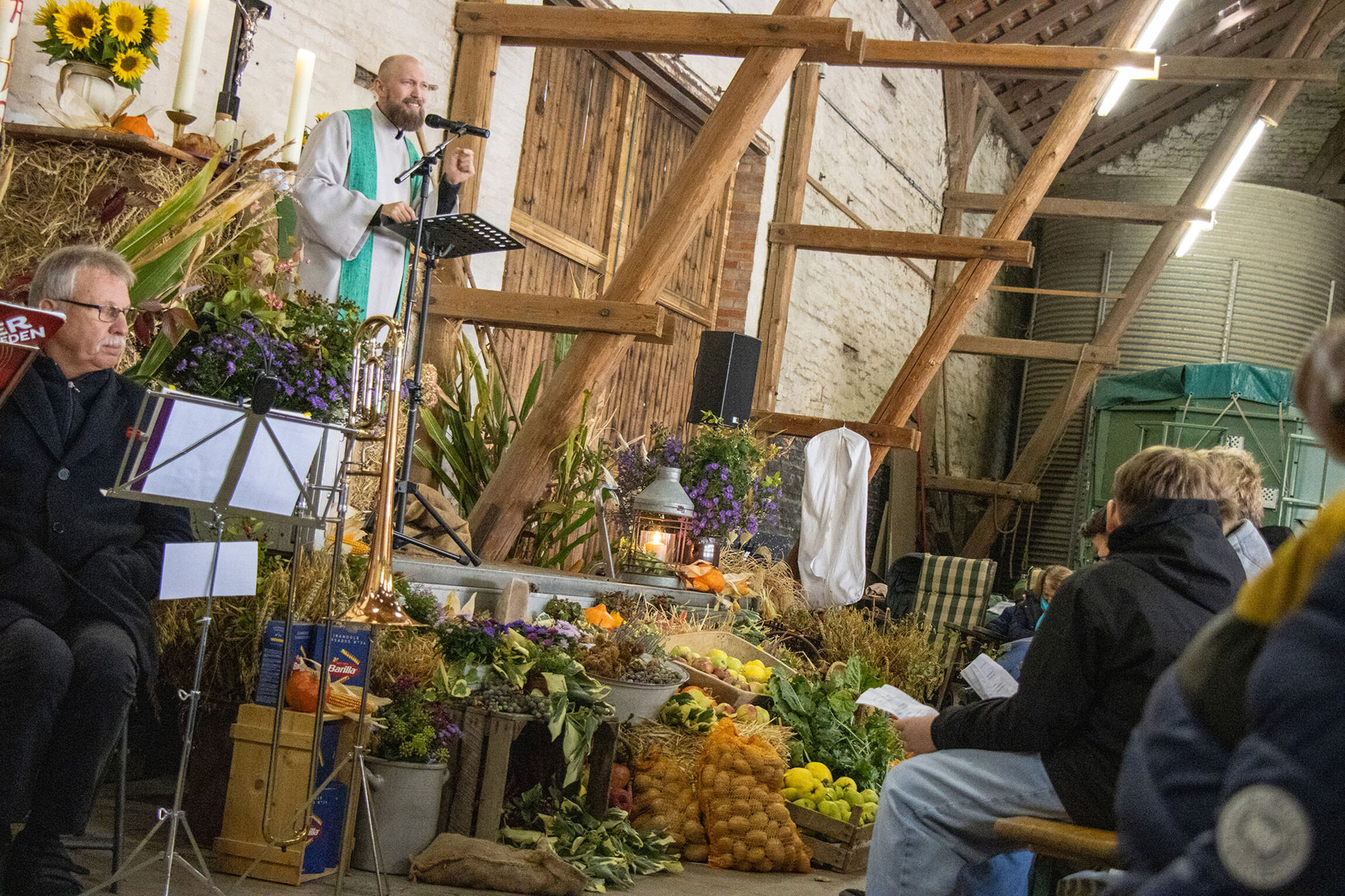 Vor dem improvisierten Altar türmten sich Kürbisse, Maiskolben, Äpfel und Heuballen zu einem farbenfrohen Erntealtar, über dem eine Erntekrone hing. Die Gaben wurden nach Angaben der Gemeinde im Anschluss an die Tafel in Sehnde weitergegeben. Der Posaunenchor begleitete den Gemeindegesang, Diakonin Elvira Fink führte mit Liedern durch den Vormittag. Trotz herbstlicher Winde blieb das Wetter freundlich.